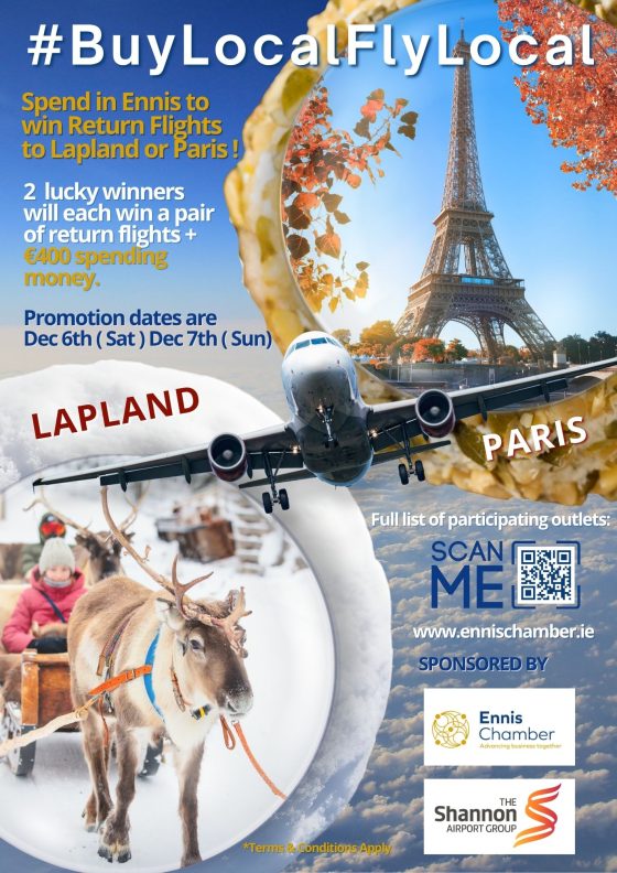 Spend a minimum of €20 in participating businesses on December 6th and 7th to enter a draw for flights for 2 to Lapland plus €400 spending money from Ennis Chamber and flights for 2 to Paris plus €400 spending money from Ennis Chamber.