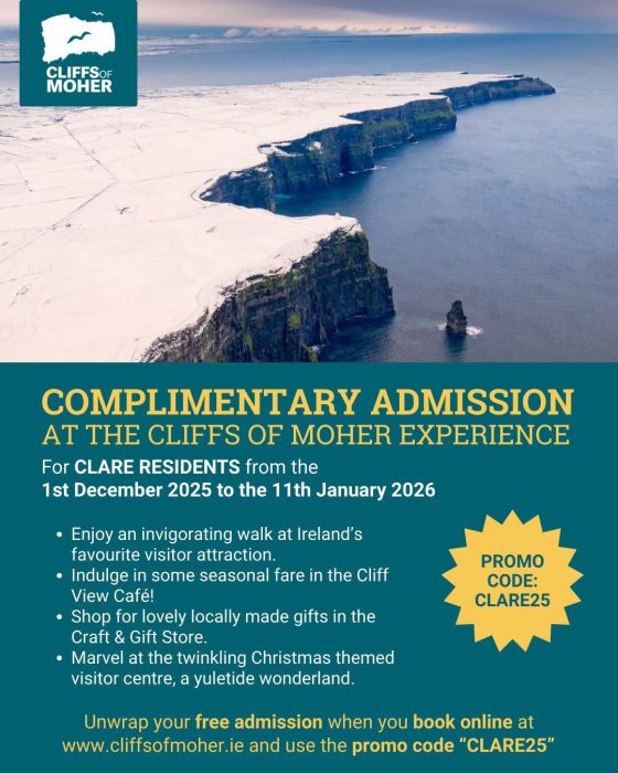Now a much appreciated annual seasonal event for the people of County Clare – the Cliffs of Moher Experience opens its doors and its world-famous, celebrated vista from December 01 to Jan 11 (inclusive), free of charge.